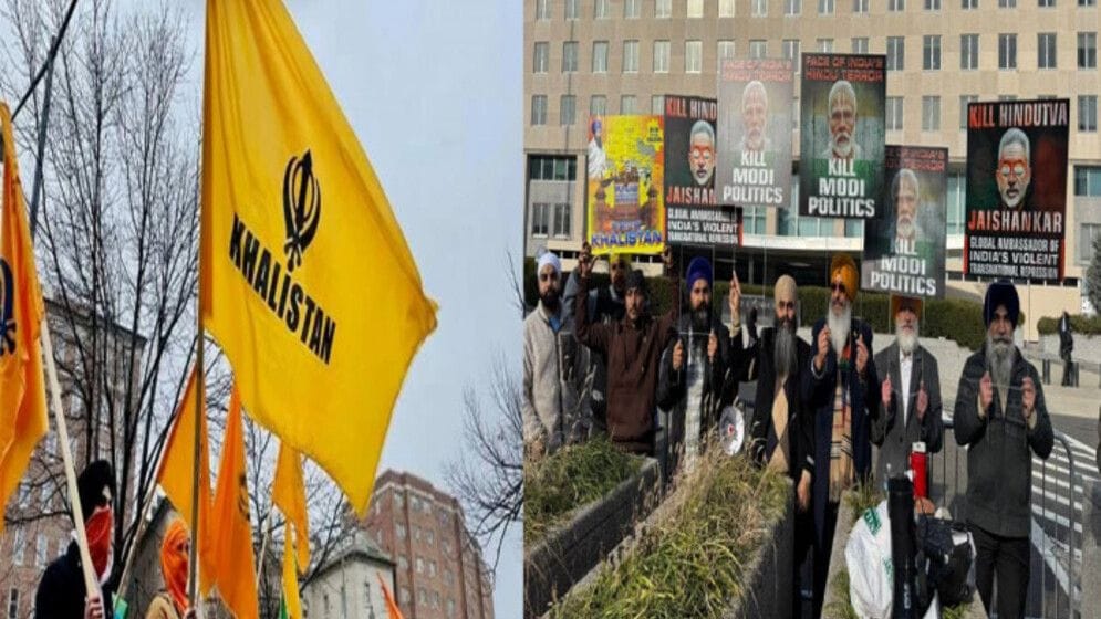 ওয়াশিংটনে বিক্ষোভকারীরা শিখ কর্মীদের হত্যার জন্য নিষেধাজ্ঞা এবং বিচার দাবি করার সময় মোদিবিরোধী স্লোগান দেয়।