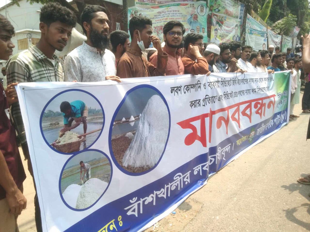 চট্টগ্রাম বাঁশখালী উপজেলা পরিষদের সামনে লবণের ন্যায্য দাম থেকে কৃষকদের বঞ্চিত করার প্রতিবাদে এবং সিন্ডিকেট ভেঙে লবণের ন্যায্যমূল্য নির্ধারণের দাবিতে মানববন্ধন অনুষ্ঠিত হয়।