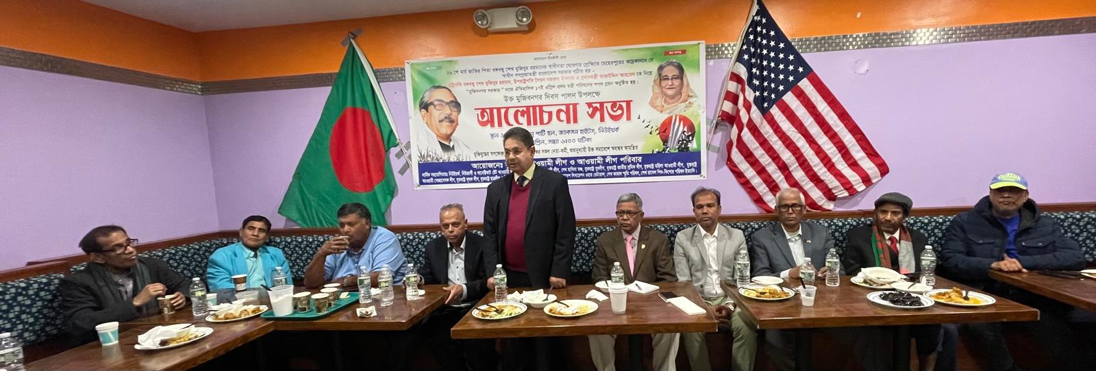 মুজিবনগর দিবস উপলক্ষে যুক্তরাষ্ট্র আওয়ামী লীগ ও আওয়ামী পরিবার এবং সকল সহযোগী অঙ্গসংগঠনের আলোচনা সভার বক্তারা ড. ইউনূসের নেতৃত্বাধীন জঙ্গি বাহিনীর শত অপতৎপরতা সত্বেও বাংলাদেশে তৃণমূলের কর্মীগণের ঘুরে দাঁড়ানোর প্রয়াসকে অভিনন্দিত করা হয় এবং একাত্তরের মত দেশপ্রেমিক প্রবাসীদের ঐক্যবদ্ধ হয়ে বাংলাদেশের উন্নয়ন-অভিযাত্রার স্বার্থে আবারো শেখ হাসিনার নেতৃত্ব প্রতিষ্ঠার সংকল্প ব্যক্ত করা হয়। একইসাথে বাংলাদেশের জামাত-শিবিরের জঙ্গি তৎপরতা রুখে দিতে যারা চরম সংকটে নিপতিত, সেসব নেতা-কর্মী ও তাদের পরিবারের অসহায় সদস্যগণের পাশে দাঁড়ানোর উদাত্ত আহ্বান জানানো হয়।খবর বার্তা সংস্থা বাপসনিউজ ।বক্তারা অভিযোগ করেন যে, বাংলাদেশকে ব্যর্থ রাষ্ট্রে, জঙ্গি রাষ্ট্রে পরিণত করার নীল নক্সা বাস্তবায়নের গভীর ষড়যন্ত্রের বিরুদ্ধে রুখে দাড়ানোর পরিবর্তে যারা আত্মগোপনে গেছেন কিংবা পালিয়ে আমেরিকা, কানাডা, যুক্তরাজ্য, ভারতে অবস্থান নিয়েছেন, তাদের ভ’মিকা সরব থাকার পরিবর্তে একেবারেই নির্লিপ্ততা আওয়ামী লীগকে নির্মূল করার সামিল। এসব নেতাদের চিহ্নিত করার প্রয়োজনীয়তার কথাও বলেন কয়েকজন। এক্ষেত্রে সভাপতি শেখ হাসিনার তৃণমূল নেতা-কর্মীগণের সাথে টেলিফোনে কথা বলার ব্যাপারটিকে সকলে সাধুবাদ জানিয়েছেন। তারফলেই রাজধানী ঢাকাসহ দেশের বিভিন্ন স্থানে জয় বাংলা স্লোগানে ঝটিকা মিছিল অনুষ্ঠিত হচ্ছে বলে মন্তব্য করেন বক্তারা।