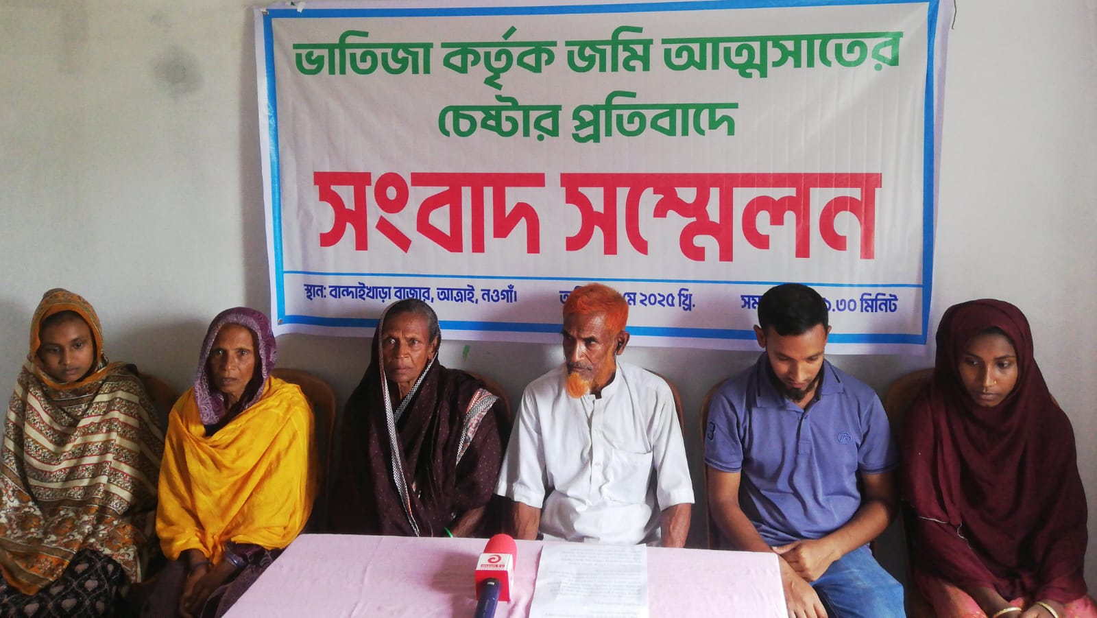 নওগাঁর আত্রাই উপজেলার বান্দাই খাড়ারায় প্রতিবন্ধী মজিবর মন্ডল তার ভাতিজা মতিউর রহমান কর্তৃক জমি আত্মসাতের চেষ্টার প্রতিবাদে বুধবার দুপুরে বান্দাই খাড়া বাজার এলাকায় এক সংবাদ সম্মেলন করেছেন।