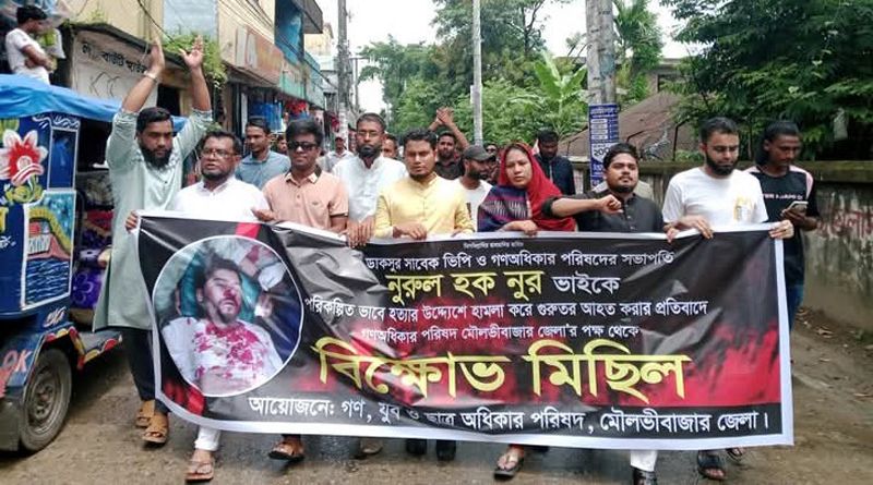 জাতীয় গণঅধিকার পরিষদের কেন্দ্রীয় সভাপতি ও সাবেক ডাকসু ভিপি নুরুল হক নুরসহ নেতা-কর্মীদের ওপর রাজধানীতে নৃশংস হামলার প্রতিবাদে মৌলভীবাজার জেলা শহরে বিক্ষোভ মিছিল ও প্রতিবাদ সমাবেশ করেছে গণঅধিকার পরিষদের নেতা-কর্মীরা।