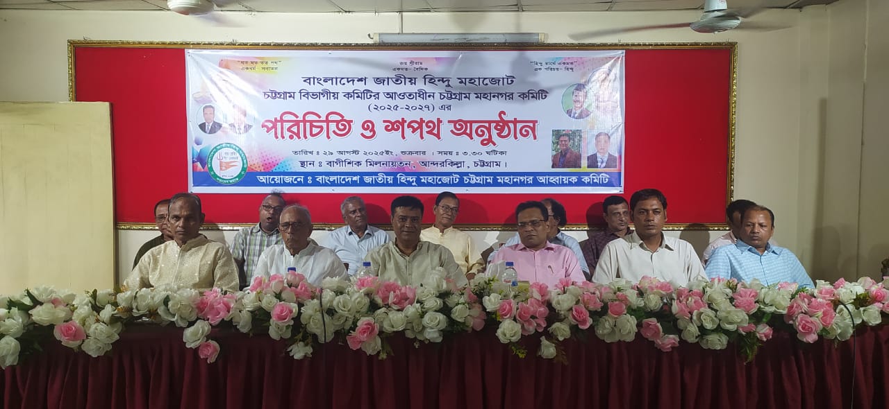 বাংলাদেশ জাতীয় হিন্দু মহাজোট চট্টগ্রাম বিভাগীয় কমিটির আওতাধীন চট্টগ্রাম মহানগরের নবনির্বাচিত কমিটি ঘোষণা,পরিচিতি ও শপথ গ্রহণ অনুষ্ঠান বাংলাদেশ জাতীয় হিন্দু মহাজোট চট্টগ্রাম বিভাগীয় কমিটির সহ সাধারণ সম্পাদক ও কমিটি গঠন কল্পে গঠিত আহবায়ক কমিটির সম্মানিত আহবায়ক দয়াল কান্তি সামন্ত এর সভাপতিত্বে ২৯ আগস্ট ২০২৫ শুক্রবার বিকাল ৩.৩০ ঘটিকায় চট্টগ্রাম আন্দরকিল্লাস্থ বাগীশিক মিলনায়তনে অনুষ্টিত হয়।