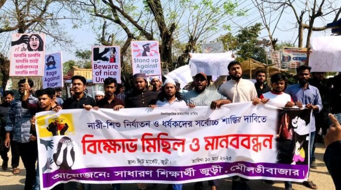 দেশব্যাপী নারীদের প্রতি সহিংসতার প্রতিরোধে মৌলভীবাজারের জুড়ীতে মানববন্ধন করেছে শিক্ষার্থীরা। সোমবার (১০ মার্চ) দুপুর ২ টায় জুড়ী ভবানীগঞ্জ বাজারের নিউ মার্কেট এলাকা থেকে শুরু করে বিজিবি ক্যাম্প প্রদক্ষিণ করে নিউ
